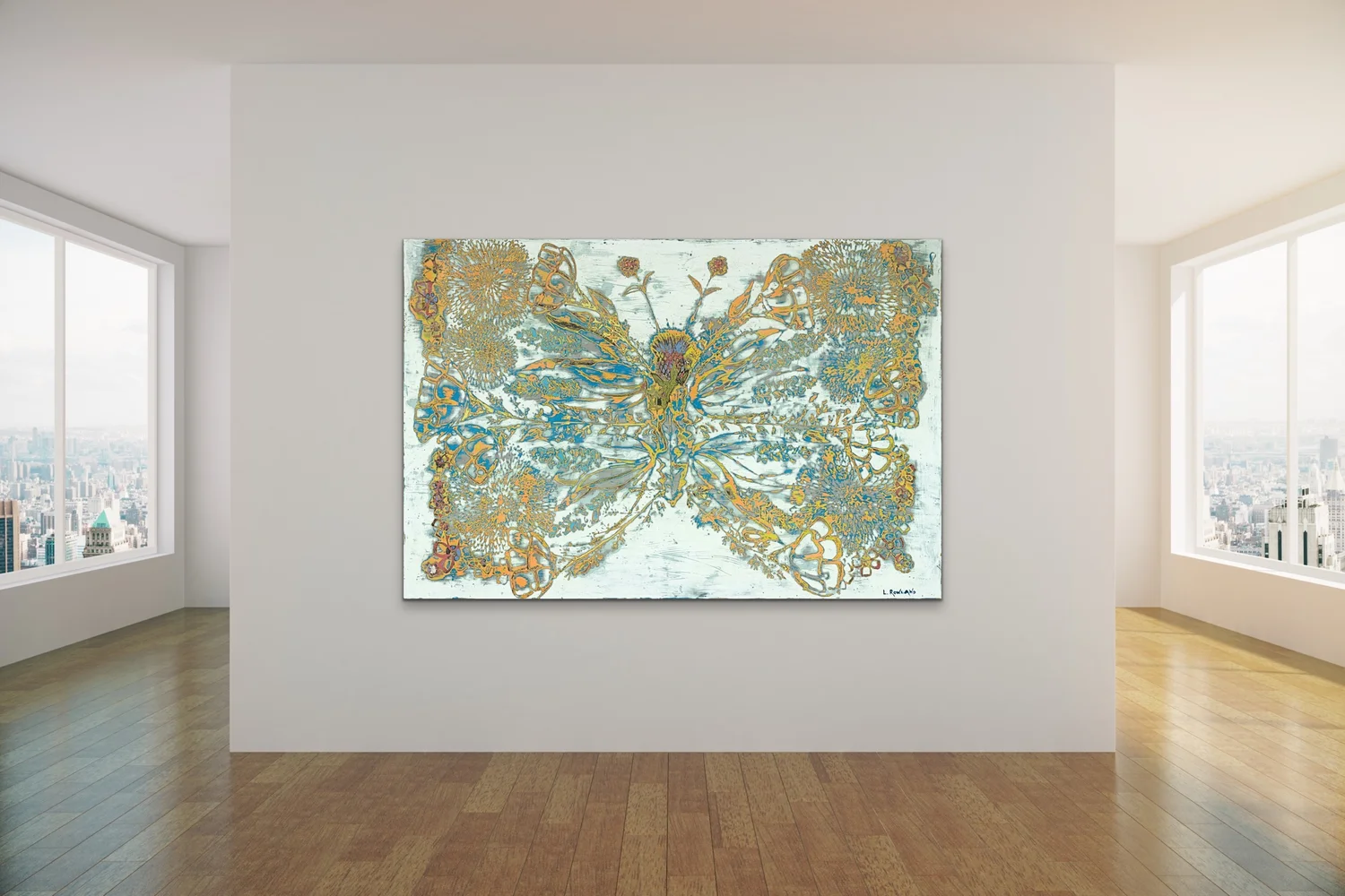 This painting depicts a butterfly puzzled together with flowers it pollinates and derives nectar from. It is an attempt to show interconnectedness in nature and a reminder that things in nature have value that is independent and greater than any value that humankind places on them. They are innately valuable in their own right.