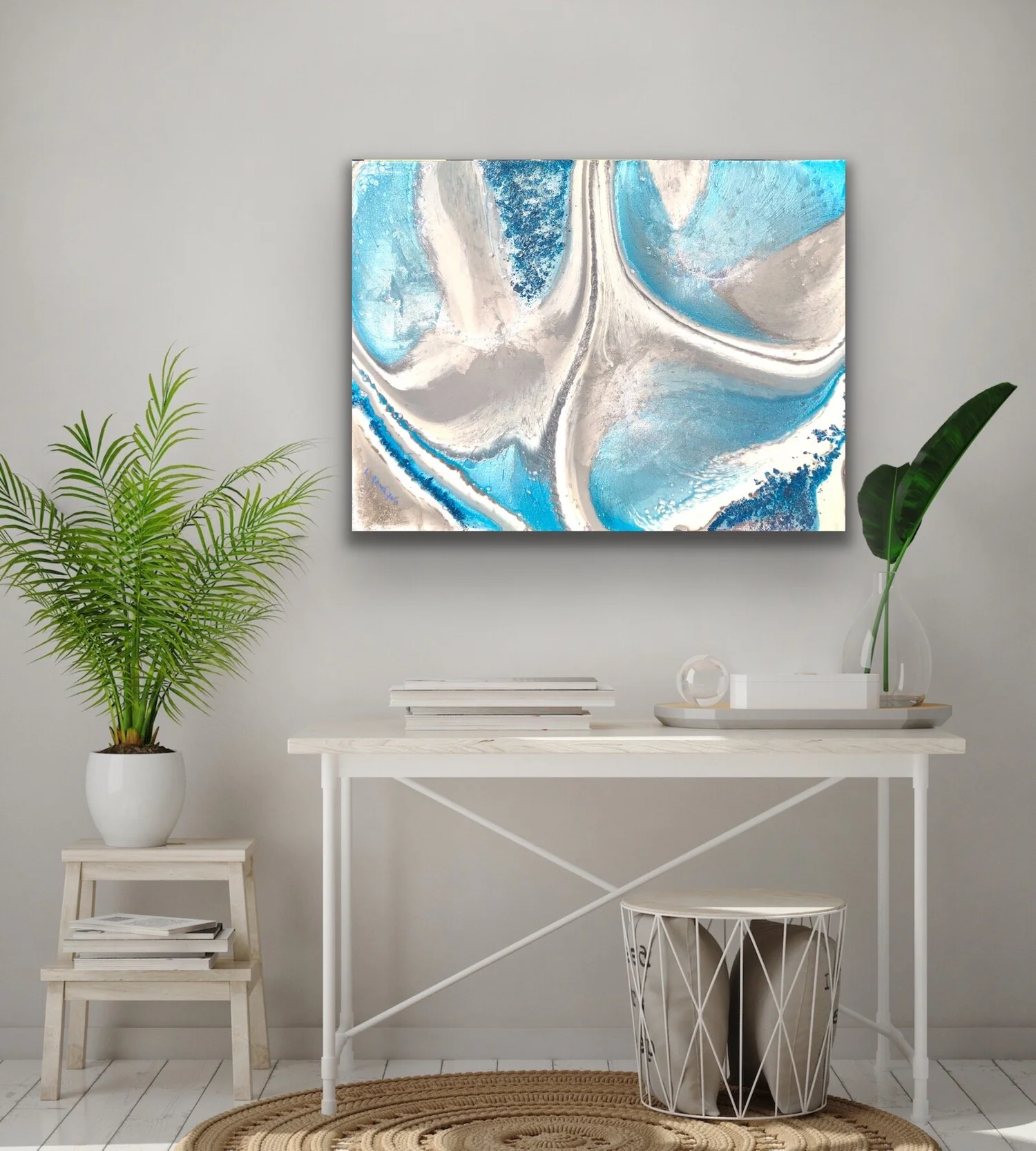 These paintings are created by making paint out of resin then applying it to canvas. Each color is applied separately. The artist has the task of anticipating and directing the motion of the resin, which continues to move after it is applied. This understanding of the movement of the medium comes from many years of practice. This medium allows the artist to create beautiful and dynamic works of art that look like they are still in liquid motion.